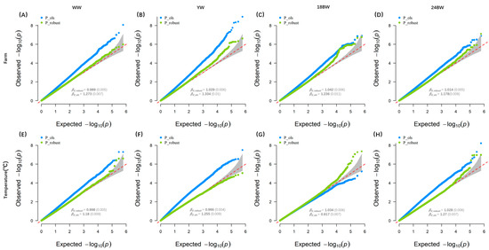 QQ-Plots for the GWEIS analysis using traditional model-based (blue) and robust (green) variance estimator. (A–D) QQ-Plots of −log10 (p-value) for the weaning weight (WW), the yearling weight (YW), the body weight of 18 months (18 BW), and the body weight of 24 months (24 BW) across farms, respectively. (E–H) QQ-Plots of −log10 (p-value) for WW, YW, 18 BW, and 24 BW across temperatures, respectively. β0 denotes LD score intercepts (with standard errors) from LDSC.