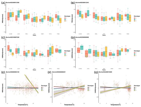 Furthermore, we further visualized genotype re-ranking by plotting the phenotypic performance in response to environmental changes in the 29 identified independent SNPs in Figure 2 and Figures S9–S15. The 0, 1, and 2 corresponding to homozygous reference, heterozygous, and homozygous alternative genotypes were drawn with red, dark green, and golden. In this case, the superior genotypes of those SNPs would rearrange with either discrete (farm, Figure 2A–D and Figures S9–S11) or continuous (temperature, Figure 2E–G and Figures S12–S15) environmental variables. For instance, BovineHD2400013368 genotypes are ranked 2 > 1 > 0 in some farms (high latitudes such as CCXM or JLDX) and 0 > 1 > 2 in others (low latitudes such as SYHJ or YNZC) for the WW trait. The genotypes of BovineHD2400013368 exhibited negative pleiotropy and had an opposite effect across temperatures (as manifested in slope differences) for the WW trait. This verified the existence of G × E interaction regarding the change in traits-farm and/or traits-temperature.