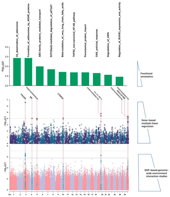 The farm effect is complex and should be emphasized in animal production since it involves many potential environmental factors that affect animal growth and development, such as management, nutrition level, and climate. Under all the GEWIS studies on growth traits with the farm as the environmental factor, we localized a total of 12 coding genes, and 3 of them showed significant interaction effects in the next gene-based analyses, namely SMAD2, PALMD, and MECOM, which were distributed on BTA 24, BTA 3, and BTA 1 associated with WW, 12 BW, and 18 BW, respectively. SMAD2 regulates a variety of cellular processes by mediating transforming growth factor (TGF)-β signaling and is involved in the regulation of reproduction and embryonic development in cattle [43]. Meanwhile, SMAD2 can regulate the level of myogenic inhibitors in the biological organism, thus participating in myofiber proliferation and affecting growth and development [44,45]. Furthermore, in a study of SAMD2 expression in thoracic aortic aneurysms (TAAs) of different etiologies, SAMD2 was found to be epigenetically regulated, implying the presence of environmental interactions [46]. The palmdelphin (PALMD) gene was differentially expressed between high- and low-yielding Holsten cattle and thus considered to be associated with milk production traits in cattle [47], while a study on production traits in pigs [48] found that gene polymorphisms of PALMD had a significant effect on backfat thickness. The PALMD also promotes basal progenitors (BPs) proliferation via integrin signaling, which is a necessary pathway for the evolutionary expansion of the mammalian neocortex [49]. The MECOM gene, also named EVI1, encodes a protein that is an oncoprotein that may be involved in hematopoiesis, apoptosis, development, and cell differentiation and proliferation [50], and has been identified as a candidate gene associated with lung weight and kidney weight in cattle in a previous GWAS on bovine visceral organ weights by An et al. [51]. In addition, MECOM has also been reported as a candidate gene associated with lung function and longissimus dorsi development in cattle [52,53]. Similarly, in a human blood-pressure-related gene–environment interaction study, MECOM exhibited a strong interaction with smoking [54]. These functional studies suggest that these three genes may be important target genes that play important roles in the regulation of growth and development in beef cattle and receive gene–environment interactions.