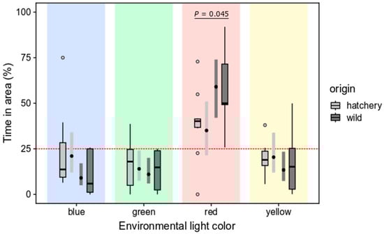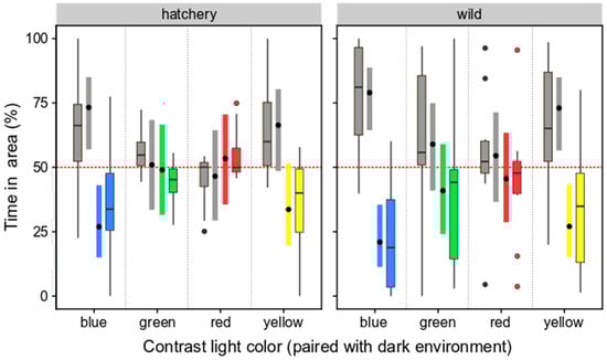 3.2.2. Selection Preferences of Wild and Hatchery-Reared Marbled Rockfish under Varied Ambient Light Colors and Darkness