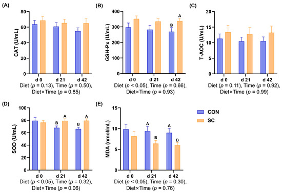 Figure 1. Bar charts showed the effects of diet treatment on the antioxidant indexes during the study period. (A) Catalase; (B) glutathione peroxidase; (C) total antioxidant capacity; (D) superoxide dismutase; (E) malondialdehyde. CON, a basal diet; SC, the basal diet with Saccharomyces cerevisiae (2 × 1010 CFU/kg of feed); n = 10. A,B Values with different superscripts refer to significant difference between the CON and SC groups at the time point (p < 0.05).