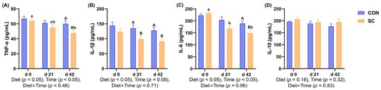 Figure 2. Bar charts showed the effects of diet treatment on the inflammatory factors during the study period. (A) Tumor necrosis factor-α; (B) interleukin-1β; (C) interleukin-6; (D) interleukin-10. CON, a basal diet; SC, the basal diet with Saccharomyces cerevisiae (2 × 1010 CFU/kg of feed); n = 10. A,B Values with different superscripts refer to significant difference between the CON and SC groups at the time point (p < 0.05). a,b Values with different superscripts mean difference between days in a group (p < 0.05).
