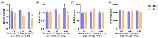 Figure 3. Bar charts showed the effects of diet treatment on the intestinal barrier function parameters levels during the study period. (A) Zonulin; (B) lipopolysaccharide; (C) diamine oxidase; (D) intestinal fatty acid-binding protein. CON, a basal diet; SC, the basal diet with Saccharomyces cerevisiae (2 × 1010 CFU/kg of feed); n = 10. A,B Values with different superscripts refer to significant difference between the CON and SC groups at the time point (p < 0.05).