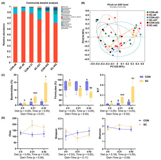The bacterial composition at the phylum level of the aged dogs in different dietary treatments during the study period is presented in Figure 4A. The PCoA indicated that at the ASV level, no significant separation was shown in the clustering of fecal microbial communities among the two treatments (p ≥ 0.05; Figure 4B). On d 21, at the phylum level (Figure 4C), the fecal bacteria of the dogs fed the SC diet exhibited a higher abundance of Bacteroidetes than the dogs fed the CON diet, while the abundance of Firmicutes was lower in the SC treatment than that in the CON treatment on d 42. Meanwhile, in the SC group, the abundance of Bacteroidetes at d 42 was higher than that at d 0 (p < 0.05), and the abundance of Firmicutes showed a significant decrease by d 21 and 42 compared to that at d 0 (p < 0.05). Moreover, the ratio of Bacteroidetes to Firmicutes in the SC treatment significantly increased compared to that in the CON treatment on d 21 and 42 (p < 0.05), and the ratio of Bacteroidetes to Firmicutes in the dogs fed the SC diet increased significantly over time (p < 0.05; Figure 4C). Compared with the dogs fed the CON diet, the Chao index showed a significant increase in the dogs fed the SC diet by d 21 (p < 0.05, Figure 4D). Neither diet treatment nor trial period affected the Shannon or Simpson indexes (p ≥ 0.05; Figure 4D).
