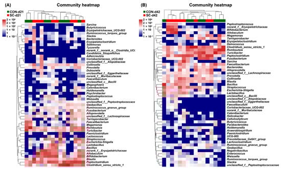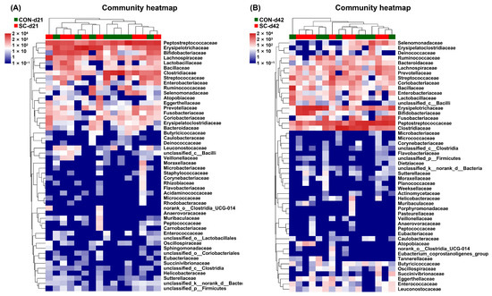 Figure 5. The relative abundance of fecal microbiota at the family level on d 21 and 42. (A) The relative abundance of fecal microbiota at the family level on d 21; (B) the relative abundance of fecal microbiota at the family level on d 42. CON, a basal diet; SC, the basal diet with Saccharomyces cerevisiae (2 × 1010 CFU/kg of feed); n = 10.