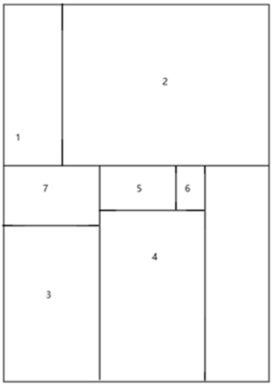Plane figure of sow and piglet living. 1. Piglet feeding trough. 2. Piglet insulation area. 3. Piglet activity area. 4. Sow restriction area. 5. Sow trough. 6. Sow automatic waterer. 7. Piglet automatic waterer.