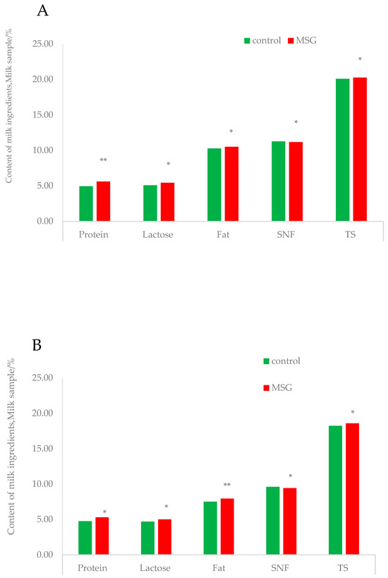 Composition of the sows’ milk between the different treatments. (A), Milk composition of sows in CON group and MSG group in week 2 of the experiment; (B), Milk composition of sows in CON group and MSG group in week 3 of the experiment. * p > 0.05, ** 0.05 < p < 0.1.
