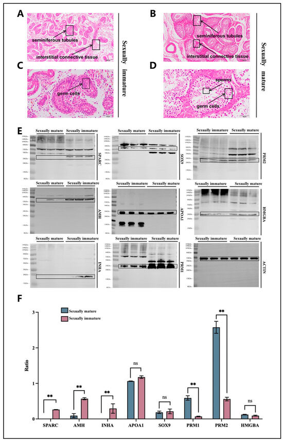 Morphological differences and identification of testicular tissue in sexually immature and sexually mature Mongolian horses. (A) Paraffin section and H.E. staining of testis of a 1-year-old Mongolian horse under light microscope at 100× magnification; scale bar 200 μm. (B) Paraffin section and H.E. staining of testis of a 10-year-old Mongolian horse under light microscope at 100× magnification; scale bar 200 μm. (C) Paraffin section and H.E. staining of testis of a 1-year-old Mongolian horse under light microscope at 400× magnification; scale bar 50 μm. (D) Paraffin section and H.E. staining of testis of a 10-year-old Mongolian horse under light microscope at 400× magnification; scale bar 50 μm. (E) WB validation of sexually immature, sexually mature marker proteins. (F) WB index gray value/inner reference gray value for sexually immature, sexually mature marker proteins (Ratio), ** indicates p < 0.01; ns indicates p > 0.05.