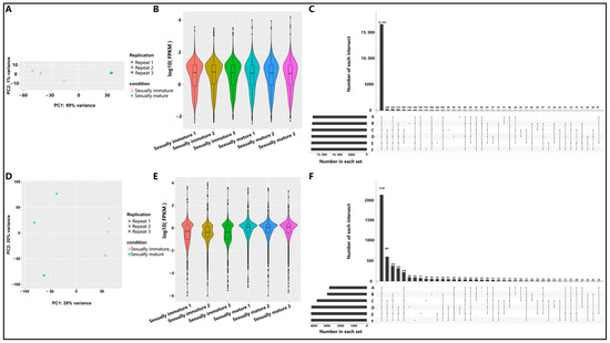 Sequencing expression profiles of mRNA and lncRNA in sexually immature and sexually mature Mongolian horse testes. (A) PCA analysis of mRNA. The abscissa represents the first principal component, and the ordinate represents the second principal component. Different shapes in the graph represent different samples, and different colors represent different groups. (B) Violin plot of mRNA FPKM. The abscissa represents different samples, while the ordinate represents the logarithm of the FPKM value of the gene to base 10. (C) Upset plot of mRNA identified in each sample. “Number in each set” represents the total number of genes identified in each sample; “Number of each intersection” represents the number of genes identified across multiple samples; the connecting line of all points on the abscissa represents the number of common genes identified across all samples, while the remaining single points or connecting lines of multiple points represent the number of unique genes identified in the relevant samples. B: Sexually immature 1, F: Sexually immature 2, A: Sexually immature 3, E: Sexually mature 1, D: Sexually mature 2, C: Sexually mature 3. (D) PCA analysis of lncRNA. The abscissa represents the first principal component, and the ordinate represents the second principal component. Different shapes in the graph represent different samples, and different colors represent different groups. (E) Violin plot of lncRNA FPKM. The abscissa represents different samples, while the ordinate represents the logarithm of the FPKM value of the gene to base 10. (F) Upset plot of lncRNA identified in each sample. “Number in each set” represents the total number of genes identified in each sample; “Number of each intersection” represents the number of genes identified across multiple samples; the connecting line of all points on the abscissa represents the number of common genes identified across all samples, while the remaining single points or connecting lines of multiple points represent the number of unique genes identified in the relevant samples. A: Sexually immature 1, C: Sexually immature 2, B: Sexually immature 3, F: Sexually mature 1, E: Sexually mature 2, D: Sexually mature 3.