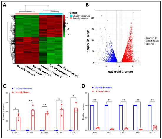 We conducted differential expression analysis of mRNAs using DESeq, with the criteria for selecting differentially expressed genes set as a fold change of |log2FoldChange| > 1 and a significance level of p-value < 0.05. Using the sexually immature age group as the treatment group and the sexually mature age group as the control group, a total of 9217 genes with significant differential expression were identified between the two groups (Figure 3A,B). Compared to the control group, 5086 upregulated genes and 4131 downregulated genes were identified (Figure 3B). To further validate the authenticity of these differentially expressed genes, real-time fluorescent quantitative PCR experiments were performed. The results showed that during sexually maturity, the relative expression levels of CYP19A1 and SPEM2 were significantly higher than those in the sexually immature stage (p < 0.05); the relative expression levels of GSTA1, DNAAF1, and TUBA3 were extremely significantly higher than those in the sexually immature stage (p < 0.01) (Figure 3C), whereas the relative expression levels of DLK1, SPP1, LAMB1, ART4, and DSC2 were extremely significantly lower than those in the sexually immature stage (p < 0.01) (Figure 3D). This result is highly consistent with the previous sequencing results.