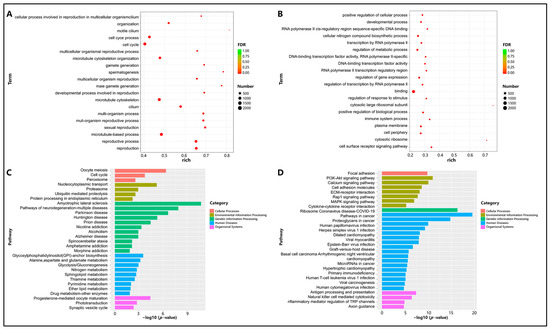 Enrichment analysis of differentially expressed mRNAs in testes of sexually immature and sexually mature Mongolian horses. (A) Upregulation of GO terms for differential genes (p < 0.01). (B) Downregulation of GO terms for differential genes (p < 0.01). (C) Upregulation of the KEGG pathway for differential gene enrichment (p < 0.01). (D) Downregulation of the KEGG pathway for differential gene enrichment (p < 0.01).