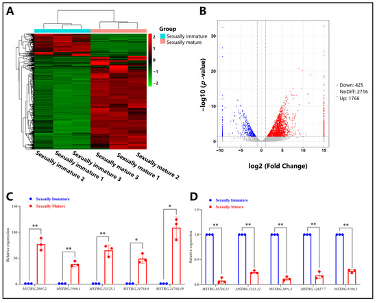 We conducted differential expression analysis of lncRNAs using DESeq, with criteria for selecting differentially expressed genes set as a fold change of |log2FoldChange| > 1 and a significance level of p-value < 0.05. Using the sexually immature age group as the treatment group and the sexually mature age group as the control group, a total of 2191 genes with significant differential expression were identified between the two groups (Figure 5A,B). Compared to the control group, 1766 upregulated genes and 425 downregulated genes were identified (Figure 5B). The number of differentially expressed lncRNAs was relatively smaller compared to mRNAs (Figure 3B and Figure 5B). To further validate the authenticity of these differentially expressed genes, real-time fluorescent quantitative PCR experiments were performed. The results indicate that during the sexually mature age stage, the relative expression levels of MSTRG.24760.9 and MSTRG.24760.19 were significantly higher than those in the sexually immature stage (p < 0.05). The relative expression levels of MSTRG.2905.2, MSTRG.1990.1, and MSTRG.12525.1 were highly significantly elevated compared to the sexually immature stage (p < 0.01) (Figure 5C). Conversely, the relative expression levels of MSTRG.16724.13, MSTRG.5223.12, MSTRG.3091.2, MSTRG.12827.7, and MSTRG.9100.2 were significantly lower than those in the sexually immature stage (p < 0.01) (Figure 5D). This finding is highly consistent with previous sequencing results.
