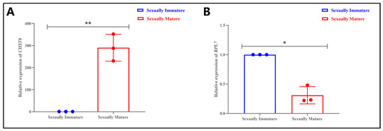 In contrast, the basic principle of trans-acting target gene prediction posits that the function of a lncRNA is independent of its genomic location relative to coding genes and is instead related to co-expressed protein-coding genes. We searched for protein-coding genes within 100 kb upstream and downstream of the lncRNA gene, considering these as potential cis-regulatory target genes for the corresponding lncRNA. Among the top 10 closest positional relationships between the lncRNA and its cis-regulatory target genes, MSTRG.10053 (target gene: CHST8) was selected for relative expression studies using real-time fluorescent quantitative PCR. The results revealed that the relative expression level of CHST8 was significantly higher in the sexually mature age group compared to the sexually immature age group (p < 0.01) (Figure 6A), consistent with the RNA-seq results (Table S8).