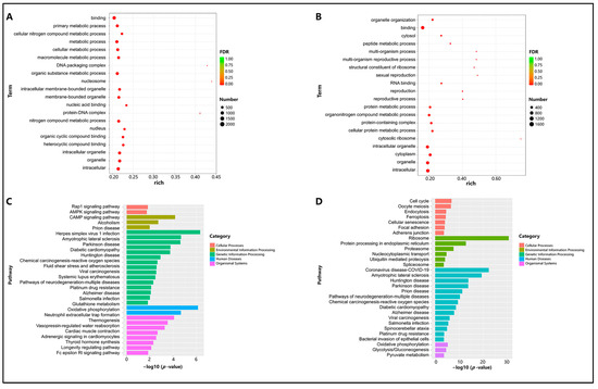 Enrichment analysis of differentially expressed lncRNAs in testes of sexually immature and sexually mature Mongolian horses. (A) Upregulation of GO terms for differential genes (p < 0.01). (B) Downregulation of GO terms for differential genes (p < 0.01). (C) Upregulation of the KEGG pathway for differential gene enrichment (p < 0.01). (D) Downregulation of the KEGG pathway for differential gene enrichment (p < 0.01).