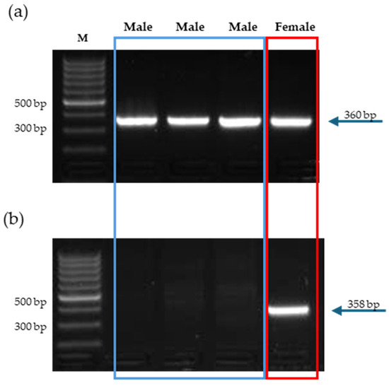 Figure 1 shows their analysis on a 1.5% agarose gel. The male characteristic DNA banding pattern indicated the presence of just one band in the PCR reaction, where the primers ZF/ZW were used, and the complete absence of the band in the other reaction (WF/WR), contrary to a female pattern where the presence of both fragments is visible to distinguish between the two sexes properly.