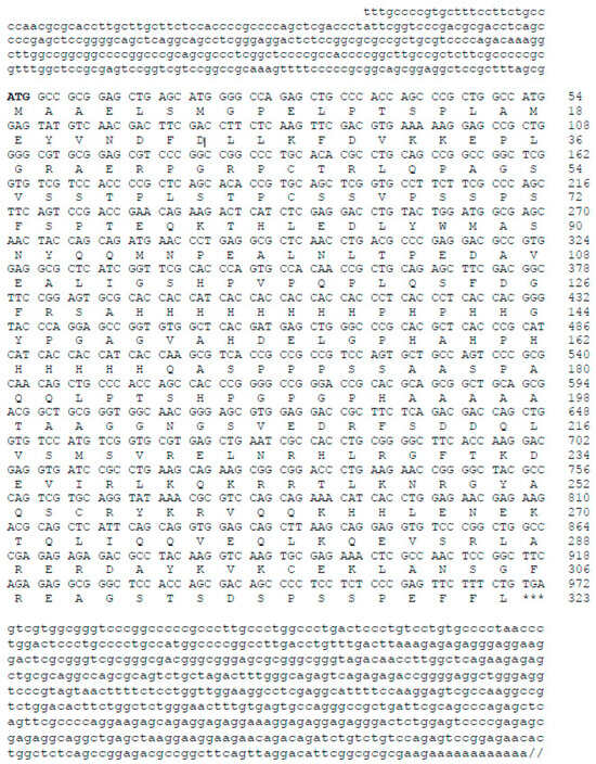 DNA sequencing analysis revealed that the isolated and cloned cDNA of hamster MafB consisted of 3066 base pairs (bp), with a 5′-untranslated region (5′-UTR) of 308 bp and a 3′-UTR of 1789 bp. The isolated cDNA clone contained an open reading frame (ORF) of 969 bp encoding 323 amino acids (Figure 1). The nucleotide and deduced amino acid sequences were submitted to the GenBank database (accession number MZ215994).