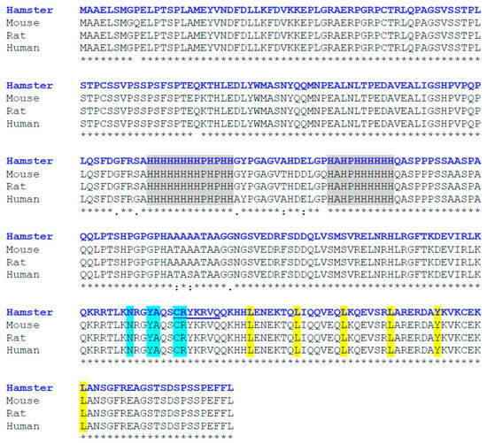 Multiple alignment of amino acid sequences of hamster MafB with those of other mammalian species (Mus musculus, Rattus norvegicus, and Homo sapiens). Asterisks indicate amino acids consistent across all four sequences. The two histidine-rich boxes are indicated in gray. At the COOH-terminal end, the DNA-binding domain is shown in blue, the nuclear localization signal is underlined, and the bZIP domain appears in yellow. Sequence alignment was performed using ClustalW.
