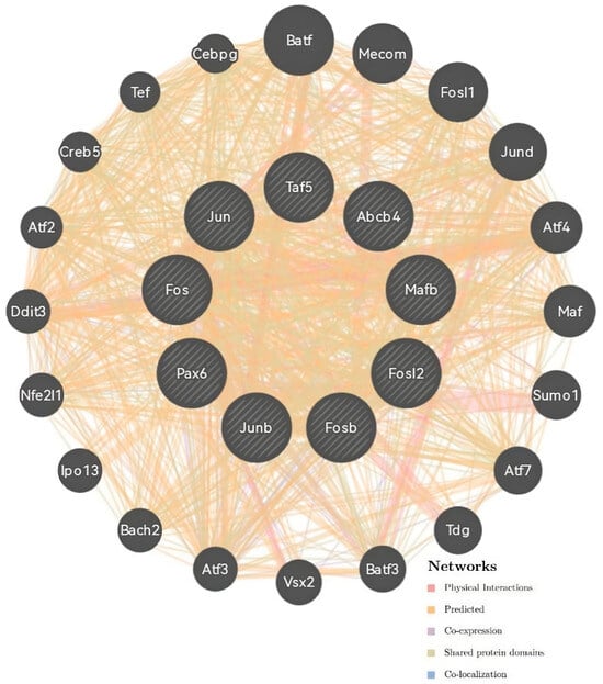 Next, protein and genetic interactions, pathways, co-expression, and co-localization and protein domain similarity were analyzed using the GeneMANIA server (Figure 3). Co-expression predictions were identified with ATP-binding cassette, sub-family B, member 4 (Abcb4); nuclear factor, erythroid-derived 2,-like 1 (Nfe2l1), FOS-like antigen 2 (Fosl2); FBJ osteosarcoma oncogene B (Fosb); JunB proto-oncogene (Junb); and Jun proto-oncogene (Jun). Physical interactions were predicted using Fos proto-oncogene (Fos), TATA-box binding protein associated factor 5 (Taf5), and paired box 6 (Pax6).
