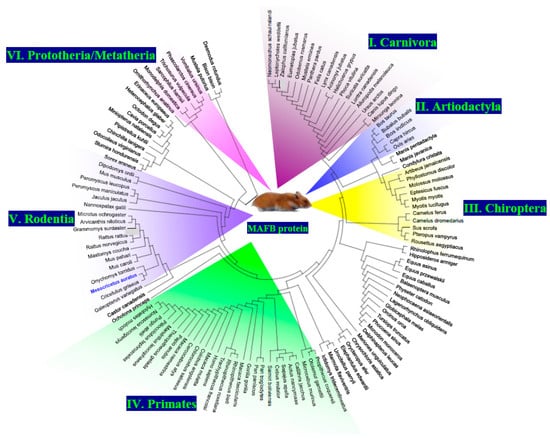 Phylogenetic analysis of the MafB protein of hamster (blue) and other mammalian species. The phylogenetic tree was assembled using MEGA X and was constructed using the maximum likelihood method and a JTT matrix-based model. This evolutionary analysis involved 126 amino acid sequences, as follows: NP_034788.1 (Mus musculus), NP_005452.2 (Homo sapiens), NP_062189.1 (Rattus norvegicus), XP_001101624.3 (Macaca mulatta), XP_002692508.1 (Bos Taurus), XP_525325.3 (Pan troglodytes), XP_012908766.1 (Mustela putorius furo), XP_023482332.1 (Equus caballus), XP_002747609.1 (Callithrix jacchus), XP_007474404.1 (Monodelphis domestica), XP_031809881.1 (Sarcophilus harrisii), XP_020846473.1 (Phascolarctos cinereus), XP_036607718.1 (Trichosurus vulpecula), XP_027723123.1 (Vombatus ursinus), XP_004585865.1 (Ochotona princeps), XP_012866530.1 (Dipodomys ordii), XP_020038332.1 (Castor Canadensis), XP_021005512.1 (Mus caroli), XP_021048660.1 (Mus pahari), XP_015854992.1 (Peromyscus maniculatus bairdii), XP_004669340.1 (Jaculus jaculus), XP_021500039.1 (Meriones unguiculatus), XP_032760554.1 (Rattus rattus), XP_028642582.1 (Grammomys surdaster), XP_031228459.1 (Mastomys coucha), XP_034352409.1 (Arvicanthis niloticus), XP_008847806.1 (Nannospalax galili), XP_027277031.1 (Cricetulus griseus), XP_028724218.1 (Peromyscus leucopus), XP_036042220.1 (Onychomys torridus), XP_005363051.1 (Microtus ochrogaster), XP_005002829.1 (Cavia porcellus), XP_005392579.1 (Chinchilla lanigera), XP_004630965.1 (Octodon degus), XP_004874085.1 (Heterocephalus glaber), XP_005329891.1 (Ictidomys tridecemlineatus), XP_026239080.1 (Urocitellus parryii), XP_027801177.1 (Marmota flaviventris), XP_026925892.1 (Acinonyx jubatus), XP_030165456.1 (Lynx canadensis), XP_023107022.1 (Felis catus), XP_019314045.1 (Panthera pardus), XP_025325854.1 (Canis lupus dingo), XP_026359290.1 (Ursus arctos horribilis), XP_032694433.1 (Lontra canadensis), XP_032206561.1 (Mustela erminea), XP_004412027.1 (Odobenus rosmarus divergens), XP_029772639.1 (Suricata suricatta), XP_019654468.2 (Ailuropoda melanoleuca), XP_027977768.1 (Eumetopias jubatus), XP_027479414.1 (Zalophus californianus), XP_021544629.1 (Neomonachus schauinslandi), XP_035977278.1 (Halichoerus grypus), XP_006746707.1 (Leptonychotes weddellii), XP_034862207.1 (Mirounga leonina), XP_032275900.1 (Phoca vitulina), XP_020725392.1 (Odocoileus virginianus texanus), XP_010827540.1 (Bison bison bison), XP_027414344.1 (Bos indicus x Bos taurus), XP_006065979.1 (Bubalus bubalis), XP_017913355.1 (Capra hircus), XP_012044596.3 (Ovis aries), XP_013840831.2 (Sus scrofa), XP_032318191.1 (Camelus ferus), XP_031289675.1 (Camelus dromedarius), XP_024598990.1 (Neophocaena asiaeorientalis asiaeorientalis), XP_026934105.1 (Lagenorhynchus obliquidens), XP_030699450.1 (Globicephala melas), XP_004272898.1 (Orcinus orca), XP_004311902.1 (Tursiops truncatus), XP_032462789.1 (Phocoena sinus), XP_029077669.1 (Monodon monoceros), XP_022448116.2 (Delphinapterus leucas), XP_028355533.1 (Physeter catodon), XP_036681764.1 (Balaenoptera musculus), XP_007521706.1 (Erinaceus europaeus), XP_004612547.1 (Sorex araneus), XP_004687441.1 (Condylura cristata), XP_011364910.1 (Pteropus vampyrus), XP_015993032.1 (Rousettus aegyptiacus), XP_032950919.1 (Rhinolophus ferrumequinum), XP_036899957.1 (Sturnira hondurensis), XP_037020425.1 (Artibeus jamaicensis), XP_024415040.1 (Desmodus rotundus). XP_028380257.1 (Phyllostomus discolor), XP_016074787.1 (Miniopterus natalensis), XP_019492655.1 (Hipposideros armiger), XP_036274169.1 (Pipistrellus kuhlii), XP_008156672.1 (Eptesicus fuscus), XP_036177934.1 (Myotis myotis), XP_006085239.1 (Myotis lucifugus), XP_036101794.1 (Molossus molossus), XP_014701439.1 (Equus asinus), XP_008510758.1 (Equus przewalskii), XP_036758180.1 (Manis pentadactyla), XP_017504927.2 (Manis javanica), XP_008587889.1 (Galeopterus variegatus), XP_011784437.1 (Colobus angolensis palliatus), XP_008015551.1 (Chlorocebus sabaeus), XP_011921032.1 (Cercocebus atys), NP_001306451.1 (Macaca fascicularis), XP_011764992.1 (Macaca nemestrina), XP_003904790.1 (Papio anubis), XP_025255497.1 (Theropithecus gelada), XP_011830354.1 (Mandrillus leucophaeus), XP_033042310.1 (Trachypithecus francoisi), XP_017714609.1 (Rhinopithecus bieti), XP_010372973.1 (Rhinopithecus roxellana), XP_023083683.1 (Piliocolobus tephrosceles), XP_004062201.1 (Gorilla gorilla gorilla), XP_003825940.1 (Pan paniscus), XP_002830352.1 (Pongo abelii), XP_003253627.1 (Nomascus leucogenys), XP_031998418.1 (Hylobates moloch), XP_003936434.1 (Saimiri boliviensis boliviensis), XP_032150831.1 (Sapajus apella), XP_017367441.1 (Cebus imitator), XP_012310439.2 (Aotus nancymaae), XP_012507521.1 (Propithecus coquereli), XP_012610703.1 (Microcebus murinus). XP_003787643.1 (Otolemur garnettii), XP_007932858.1 (Orycteropus afer afer), XP_006881591.1 (Elephantulus edwardii), XP_006839358.1 (Chrysochloris asiatica), and XP_028926613.1 (Ornithorhynchus anatinus).