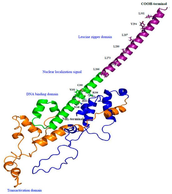 The results of the phylogenetic tree revealed that all the MafB proteins could be separated into six different groups (groups I–VI; Figure 4). The 3D structure of MafB was estimated using the Robetta software package (http://robetta.bakerlab.org, accessed on 24 July 2023) and visualized with PyMOL. This model, based on the hamster MafB protein sequence (Figure 5), revealed several domains as follows: a leucine zipper domain, a nuclear localization signal, a DNA-binding domain, and a transactivation domain.