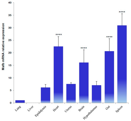 Tissue distribution of hamster MafB transcript expression determined using qPCR. The data refer to Mafb mRNA relative expression and are provided as means (bars) ± SD. **** indicates p < 0.0001.
