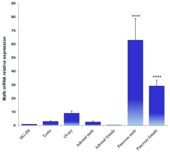 Gene expression analysis of hamster MafB transcript in endocrine tissues using qPCR. The assessed tissues included a HG of an intact male (HG-IM). The relative expression levels of the hamster MafB gene were normalized by the expression of the β-actin gene. The values represent the mean (bars) ± SD (n = 5 biological independent replicates). **** indicate p < 0.0001.