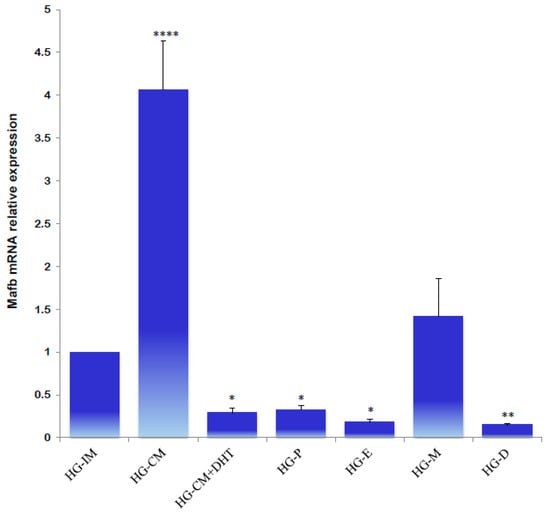 Gene expression levels of the MafB transcript from hamster HG determined using qPCR. Data from an intact male (HG-IM), a castrated male (HG-CM), a castrated male that received DHT (HG-CM + DHT), a female in proestrus (HG-P), a female in estrus (HG-E), a female in metestrus (HG-M), and a female in diestrus (HG-D) are shown. The relative expression levels of the MafB gene were calculated relative to the expression of the β-actin gene. All the data are expressed as means (bars) ± SD (n = 5 biological independent replicates). ****, ** and * indicate p < 0.0001, p < 0.01, and p < 0.05, respectively.
