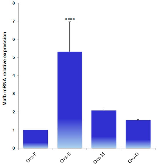qPCR quantification of MafB mRNA expression levels from hamster ovaries in proestrus (Ova-P), estrus (Ova-E), metestrus (Ova-M), and diestrus (Ova-D) females. The gene of interest was normalized to the reference gene (β-actin), and the relative expression levels were compared using the relative ΔΔCt method. The data are presented as means (bars) ± SD (n = 5 biological independent replicates). **** indicates p < 0.0001.