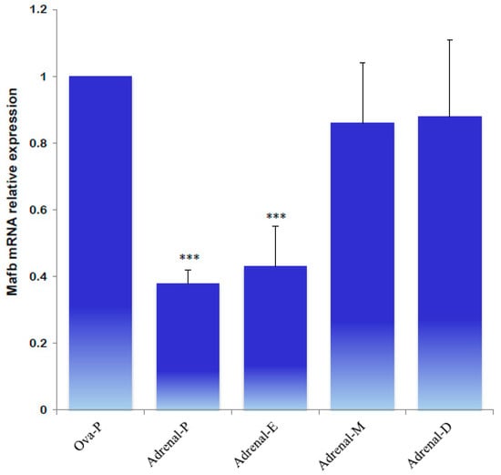 qPCR analysis of MafB transcript expression levels from hamster adrenals in proestrus (P), estrus (E), metestrus (M), and diestrus (D) females. The assessed tissues included an ovary of an intact female in proestrus (Ova-P). β-actin was used as a reference gene. The data are presented as means (bars) ± SD (n = 5 biological independent replicates). *** indicate p < 0.001.