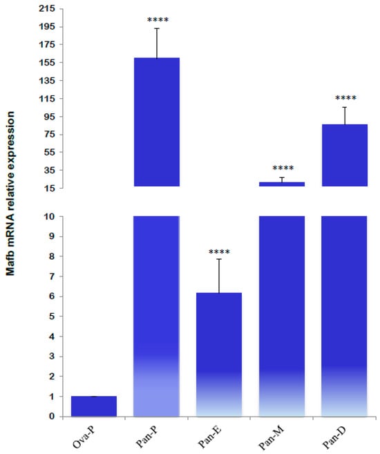 Relative mRNA expression levels of MafB transcript from hamster pancreas in proestrus (Pan-P), estrus (Pan-E), metestrus (Pan-M), and diestrus (Pan-D) females. The assessed tissues included an ovary of an intact female in proestrus (Ova-P). β-actin was used as a reference gene. The relative expression level was calculated using the ΔΔCt method. Each value of MafB mRNA represents means (bars) ± SD (n = 5 biological independent replicates). **** indicates p < 0.0001.