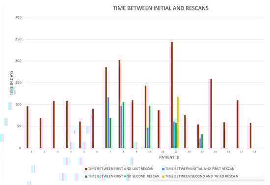 Graphic representation of the time between the initial and rescan MRIs for the 18 limbs.