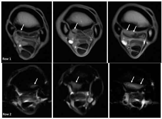 Ethical review and approval were not required for the animal study as this was a retrospective study with clinical patients. The owner of the horse or person responsible for the horse signed a consent agreement for the use of anonymous data for research when registering the patient at the clinic. The standing low-field MRI imaging parameters used during examinations of the proximal metacarpal region in this study are listed in Table 1.