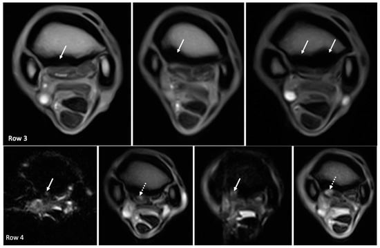 Composite figure with examples of the gradations: in row 1, hyperintense signal within the dorsal collagenous part of the proximal suspensory ligament, as seen on T1W GRE transverse images (from left to right, grade 1, grade 2, and grade 3, as indicated by the white arrows); in row 2, McIII STIR hyperintense signal on STIR FSE transverse images (from left to right, grade 1, grade 2, and grade 3, as indicated by the white arrows); in row 3, McIII sclerosis on T1W GRE transverse images (from left to right, grade 1, grade 2, and grade 3, as indicated by the white arrows); and in row 4, PSL STIR hyperintense signal in the dorsal collagenous part of the proximal suspensory ligament on STIR FSE transverse images (grade 1 and 2 as indicated by the white arrows), and the corresponding T2*W GRE transverse images with dotted arrows (also grade 1 and 2).