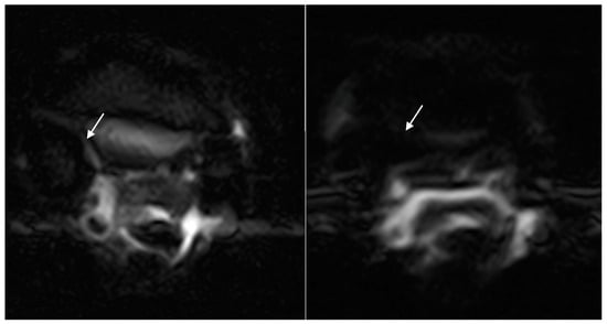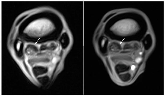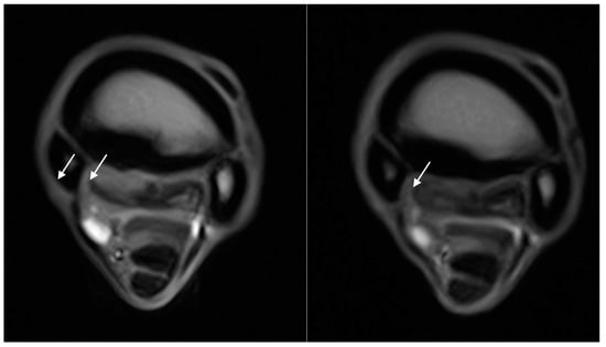 Transverse T1W GRE images (left side is medial) of the initial (left image) and rescan (right image) MRI in a 7-year-old showjumping mare. Initially, there was a grade 3 hyperintense signal within the dorsal collagenous part of the medial lobe of the LF proximal suspensory ligament, which decreased to a grade 1 in the rescan, as highlighted by the white arrow. The time between scans was 202 days, and the horse returned to full work.