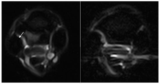 Transverse STIR FSE images (right side is medial) of the initial (left image) and rescan (right image) MRI in 6-year-old dressage pony stallion. There is a decrease in STIR hyperintense signal within the RF proximal McIII from a grade 2 (left image) to a grade 0 (right image). The STIR hyperintense signal is indicated by the white arrow in the left image. The time between scans was 61 days, and the pony returned to full work.
