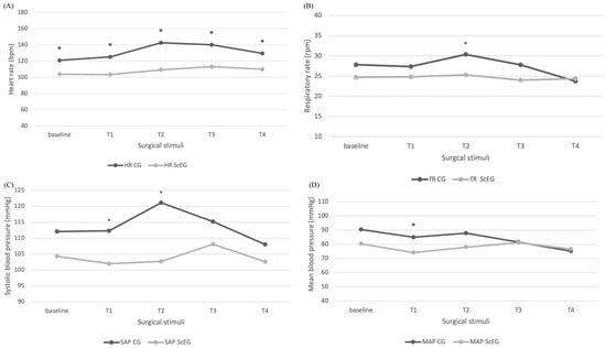 Monitoring values during five surgical times (baseline, T1, T2, T3, and T4). (A) Mean HR values in CG and EG; (B) mean fR values; (C) mean values for systolic blood pressure; and (D) median blood pressure in CG and EG during surgical times. CG = control group; fR = respiratory rate; HR = heart rate; MAP = median blood pressure; SAP = systolic blood pressure; ScEG = sacrococcygeal epidural group. * Significantly different between groups (p < 0.05).