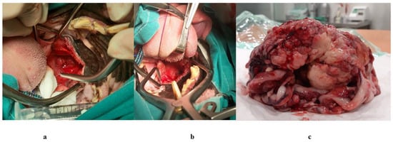 This study started on 1 January 2022 and concluded on 31 January 2024. It involved a sample of 12 dogs (N = 12) of both genders, breeds, and ages, all diagnosed with malignant nasopharyngeal processes initially characterized by cytology. These dogs were client-owned patients. Prior to their inclusion in this study, their caregivers signed an informed consent form, allowing participation in this study. Prior to surgery, each patient underwent peripheral blood sample collection from the cephalic vein after topical application of bupivacaine gel to perform a hemogram as well as liver and kidney function analysis. Additionally, all patients underwent fine needle aspiration of regional lymph nodes, and thoracic radiographs were obtained using right and left lateral projections to assess signs of lung metastases (tumor staging). A head CT of all patients was obtained to assess the extent of the tumor, regional metastasis, and bone osteolytic lesions in order to prepare for surgery. Thoracic CT images were obtained for only 4 of the 12 patients.