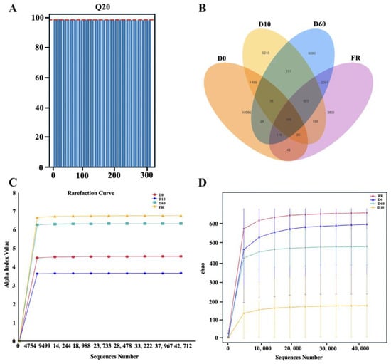 16s rRNA gene sequencing was performed on the fecal microbiota of female rabbits and their 0-, 10-, and 60-day-old rabbits. A total of 27,351,012 original sequences were obtained from 310 samples. After a series of quality control measures and bioinformatics processing, 26,331,830 valid sequences were obtained. A new dataset was formed with an average of 84,941 sequences and a Q20 of 98.53% for subsequent analysis (Figure 1A, Table S4). According to the Venn Diagram, the 0-, 10-, and 60-day-old rabbit and female rabbit groups contain 269 core ASVs, with 10,986 ASVs, 6210 ASVs, 6090 ASVs, and 3801 ASVs unique to the 0-, 10-, and 60-day-old rabbit and female rabbit groups, respectively (Figure 1B). To determine whether the sampling depth was sufficient to explain the rabbits’ fecal microbiota, rarefaction and Shannon curves were generated for the ASV quantity of each group. The results showed that as the feature sequence increased, the final curve tended to flatten, indicating that there were sufficient sequences to represent each microbiota, ensuring the adequacy and accuracy of the analysis (Figure 1C,D). In addition, we found that there were differences in the curve levels between different groups, especially the 10-day-old rabbit group, indicating potential differences in the total number and diversity of microbial populations between different groups.