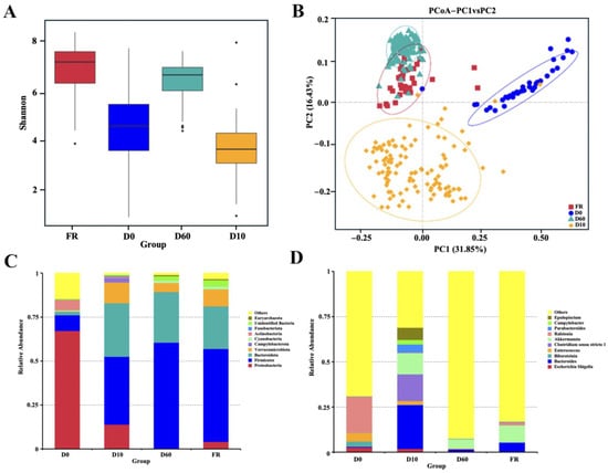 To reveal the differences in gut microbiota between female rabbits and their 0-, 10-, and 60-day-old rabbits, we conducted alpha diversity and beta diversity analyses on sequencing data. In the alpha diversity analysis, the Shannon index results showed significant differences in gut microbiota among different-day-old rabbits, with significant differences between groups of at least p < 0.01; the richness of gut microbiota first decreased and then increased (Figure 2A). In the beta diversity analysis, PCoA results showed significant differences in the composition of gut microbiota among rabbits of different ages; the gut microbiota composition of 60-day-old rabbits overlapped with that of the female rabbits, indicating that the gut microbiota composition of 60-day-old rabbits was very similar to that of the female rabbits (Figure 2B).