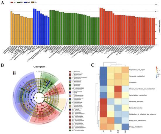 Identification and functional prediction of biomarkers for female rabbits and their different aged juvenile rabbits: (A) LEfSe analysis among different groups, with biomarkers determined by a linear discriminant analysis (LDA) score > 4. (B) Branching map of bacterial species with different abundance at different taxonomic levels. The root of the cladogram denotes the kingdom of bacteria, and the circle radiating from inside to outside represents the taxonomic levels from phylum to species. The size of each node represents relative abundance, and taxa with significant differences are painted with a designated color. (C) Heat map of significant differences in KEGG secondary metabolic pathways among groups.