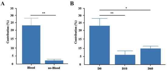 To quantify the contribution of microorganisms from 36 female rabbits to the microbial community of 155 offspring rabbits, the FEAST algorithm was used. The results showed that the contribution of gut microbiota in female rabbits to the direct offspring microbiota was significantly higher (p < 0.01) than the mean contribution of other rabbits without blood ties (Figure 4A). Without blood ties refers to having no blood relation within two generations, with a minimum coefficient of relatedness of 0. The contribution of female rabbits to the gut microbiota of rabbits on the day of birth was the highest, reaching 23.52%. Compared to the day of birth, both the contribution to the 10-day-old (6.15%, p < 0.01) and the contribution to the 60-day-old (9.87%, p < 0.05) offspring significantly decreased. There was no significant difference in the contribution of female rabbits to the gut microbiota of 10-day-old rabbits and 60-day-old rabbits (Figure 4B).