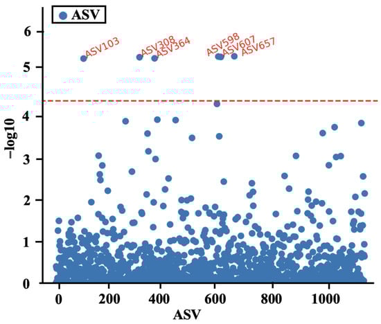 To screen for microorganisms significantly associated with body weight, six ASVs (ASV103, ASV308, ASV364, ASV598, ASV607, and ASV657) significantly associated with 60-day-old body weight (5% significance threshold) were identified through a single ASV regression analysis. Microbial group annotation was performed on these six ASVs, and it was found that all six ASVs belong to the family Spirulinaceae, among which three ASVs (ASV598, ASV607, ASV657) belong to the genus Marvinbryantia (Figure 5).