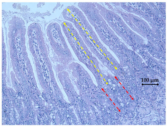 Morphometric measurements of villus height (yellow) and crypt depth (red) in weanling pigs. Representative image (200× magnification) of intestinal morphology and bar (100 μm).