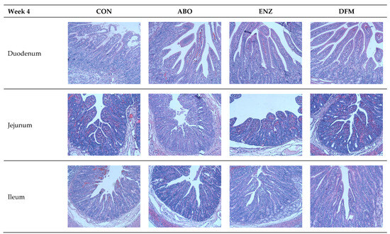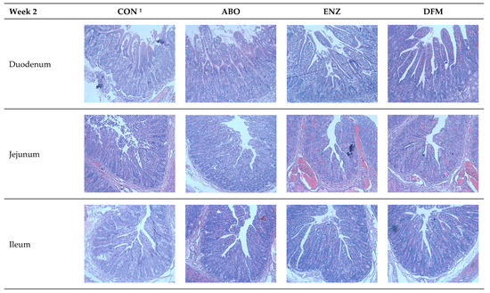 Effect of dietary treatment on intestinal morphology of weaning piglets in the duodenum (200× magnification), jejunum and ileum (100× magnification). 1 CON—control diet was the basal ration; ABO—the basal plus 100 ppm of chlortetracycline hydrochloride, 120 ppm of colistin sulfate and 30 ppm of tiamulin hydrogen fumarate; ENZ—the basal plus 2000 IU/g of α-amylase, 5000 IU/g of β-glucanase, 3000 IU/g of protease and 4000 U/g xylanase; DFM—the basal plus 5 × 107 cfu/g Bacillus subtilis and 2 × 106 Lactobacillus spp.