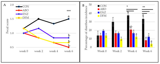 (A). Effect of dietary treatment on fecal scores of weaned piglets. Fresh excreta were ranked using the following scale: 0 = solid; 1 = semi-solid; 2 = semi-liquid; and 3 = liquid. Source: Liu et al. [29]; (*** p < 0.001). (B). Effect of dietary treatment on diarrhea incidence of weaned piglets. Diarrhea incidence = (No. of pigs in each treatment group has a clinical sign of diarrhea on the same day ×100)/Total number of pigs in the treatment group. Source: Adapted from Hart and Dobb [30]; (* p < 0.05, ** p < 0.01). a,b Different superscripts within a week indicate a significant difference. Abbreviation; CON—control diet was the basal ration; ABO—the basal plus 100 ppm of chlortetracycline hydrochloride, 120 ppm of colistin sulfate and 30 ppm of tiamulin hydrogen fumarate; ENZ—the basal plus 2000 IU/g of α-amylase, 5000 IU/g of β-glucanase, 3000 IU/g of protease and 4000 U/g xylanase; DFM—the basal plus 5 × 107 cfu/g Bacillus subtilis and 2 × 106 Lactobacillus spp.