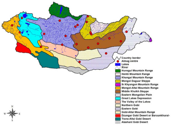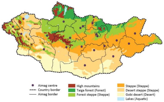 Characterized by four distinct seasons, Mongolia experiences significant temperature fluctuations and low precipitation. Summers tend to be hot, while winters are extremely cold, with January averages plummeting to as low as −30 °C. The annual mean temperature ranges between −8 °C and 6 °C, with annual mean precipitation varying from 50 mm in the Gobi Desert to 400 mm in northern mountain ranges (http://www.tsag-agaar.gov.mn; accessed on 20 April 2024).