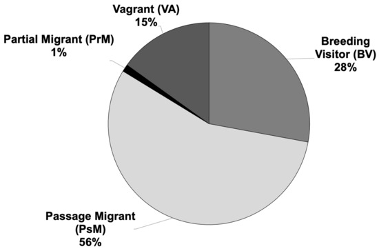In accordance with the IOC Bird List [3], our assessment has identified a total of 62 species of shorebirds, representing 22 genera and 7 families (see Appendix A). Among these species, 24 (28%) are classified as Breeding Visitors (BVs), 48 (56%) as Passage Migrants, 1 (1%) as Partial Migrant, and 13 (15%) as Vagrants (Figure 3). Given the migratory behavior inherent in all shorebird species in Mongolia, statistical analysis revealed no significant difference between each status (D = 0.219, p > 0.5). However, it is noteworthy that we documented only one species, the Solitary Snipe, which overwinters in small numbers in unfrozen open water areas of large rivers such as Khovd and Bukhmurun in the Central Asian Internal Drainage Basin in western Mongolia.