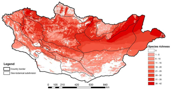 Specifically, regions with high species richness include the geo-botanical divisions of the Mongol Daguur Steppe (mean 34.5 species, range 6–42), Eastern Mongolian Plain (especially around Buir Lake and the northeastern sector) (mean 37.8 species, 26–42), northern limit of Middle Khalkh Steppe (mean 28.4 species, min. 16, max. 42), and Great Lakes Depression (mean 23.7 species, 5–42). Some parts of the Ikh Khyangan Mountain Range, eastern Khangai Mountain Range, and western Khuvsgul Mountain Range (only Darkhad Depression) are secondary areas of high species richness.
