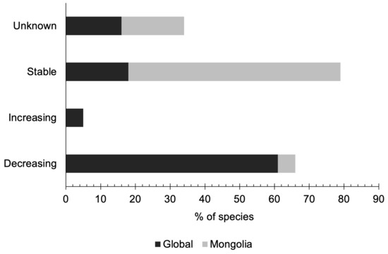 Furthermore, the IUCN global population assessment for each species was referenced from the “2004 IUCN Red List of Threatened Species” [21]. National assessments of Mongolian birds were initially published in the Regional Red List for Mongolian Birds [10], utilizing the “IUCN Red List Categories and Criteria: Version 3.1” [22], and the “Guidelines for Application of IUCN Red List Criteria at Regional Levels: Version 3.0” [21]. Global assessments of each species were cited from Birdlife International [23] and IUCN [24] (Appendix A).