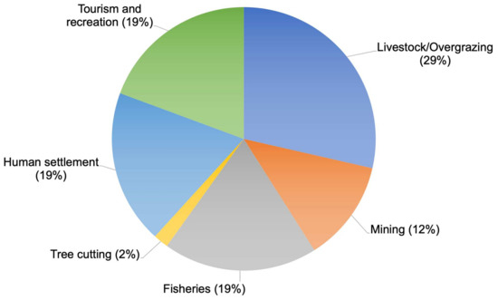 The analysis revealed no statistical difference between threats categorized under habitat loss and degradation (D = 0.274, p > 0.5). However, livestock overgrazing, resulting in habitat degradation and loss, emerged as the predominant threat, accounting for 29% of the total threats to shorebirds. This was closely followed by fisheries, including entanglement with fishing line (19%), human settlement (19%), tourism and recreation (19%), mining (12%), and tree cutting (2%), which were identified as significant risks to numerous shorebird species in Mongolia (Figure 8).